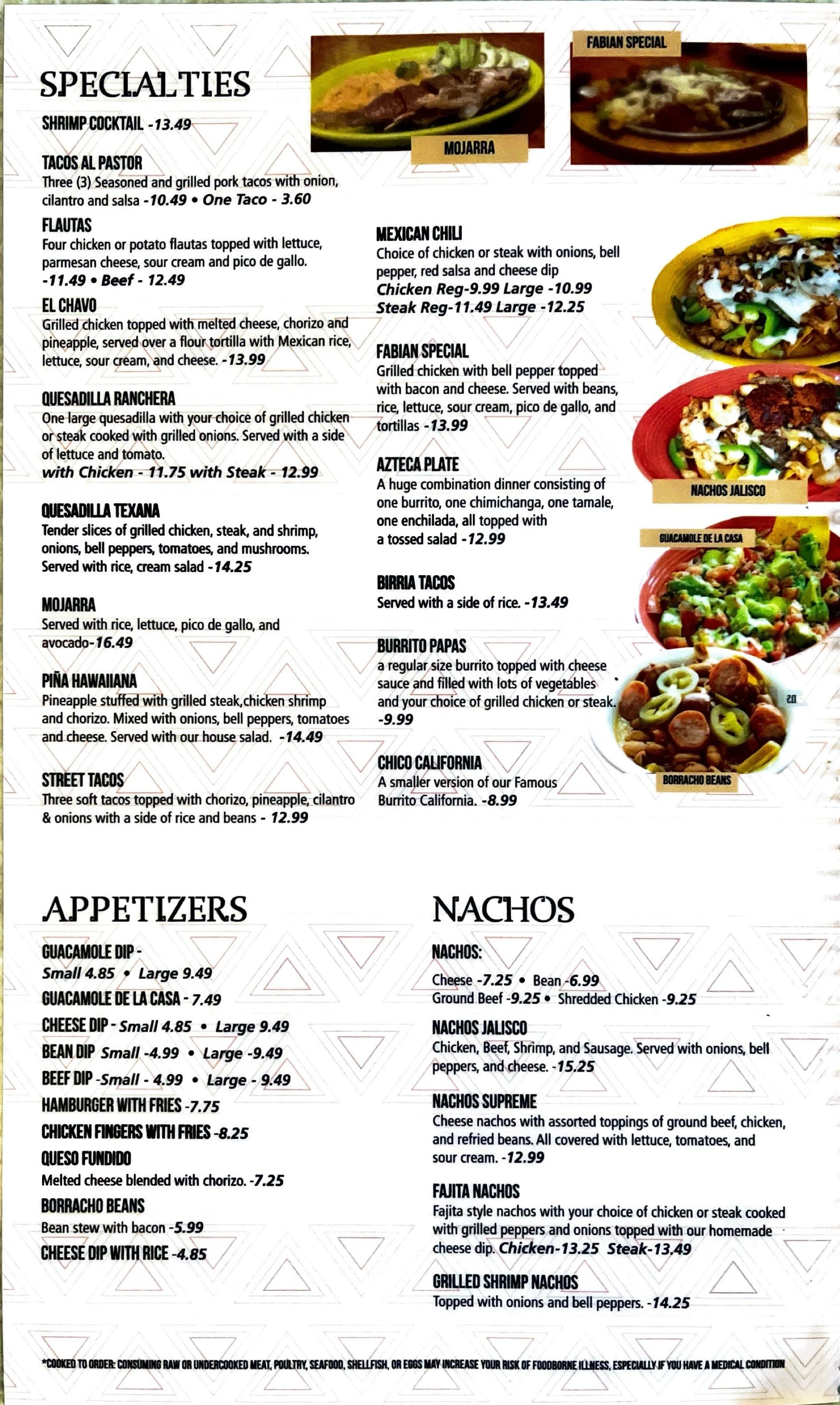 Restaurant menu featuring specialties like shrimp cocktail, tacos al pastor, flauntas, el chavo, quesadilla ranchera, quesadilla texana, mojarra, piña hawaiana, street tacos, mexican chili, fabian special, azteca plate, birria tacos, burrito papas, c