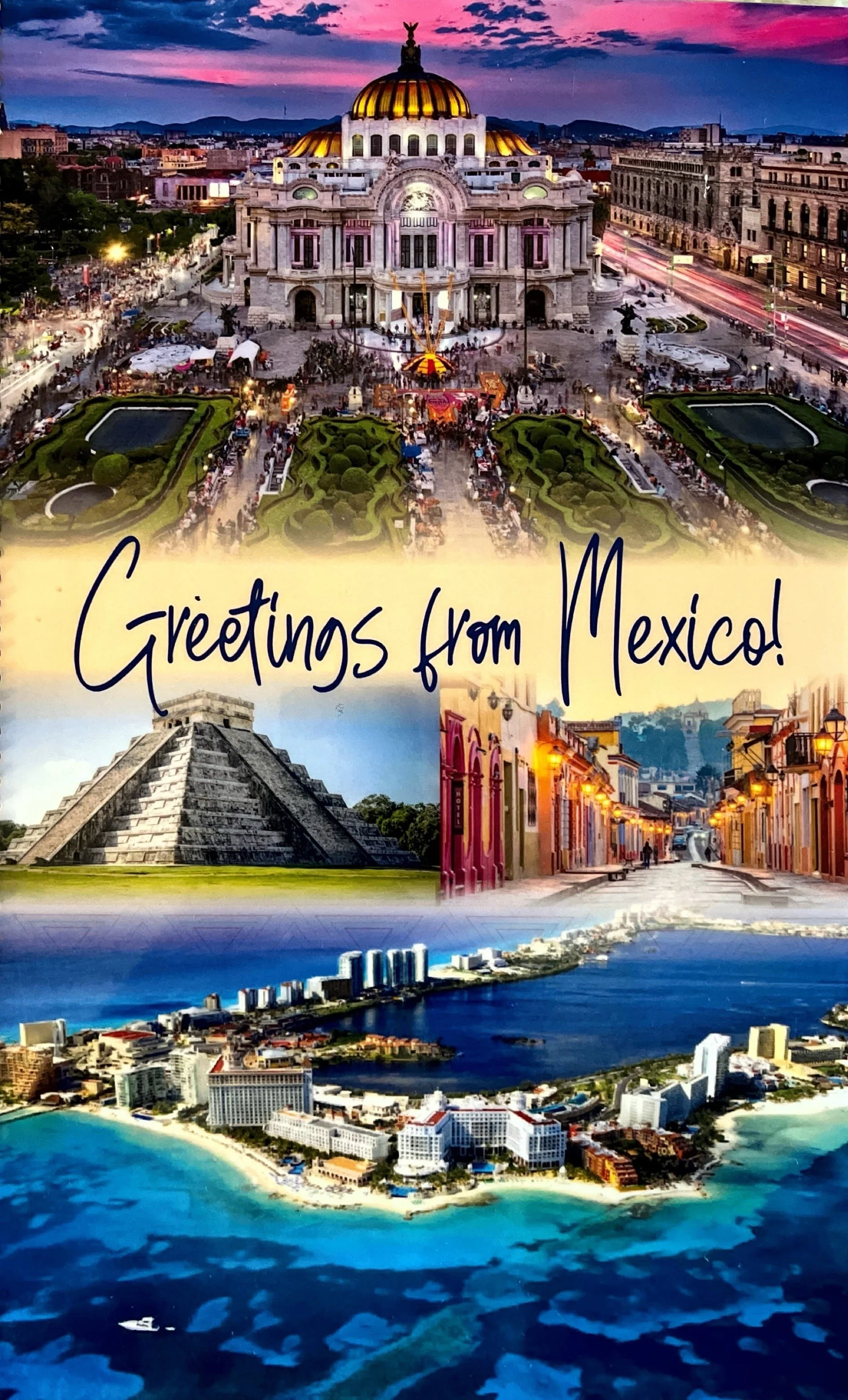 Postcard with images of Mexico City, Chichen Itza, colorful street in Mexico, and Cancun beach, with the text "Greetings from Mexico!"