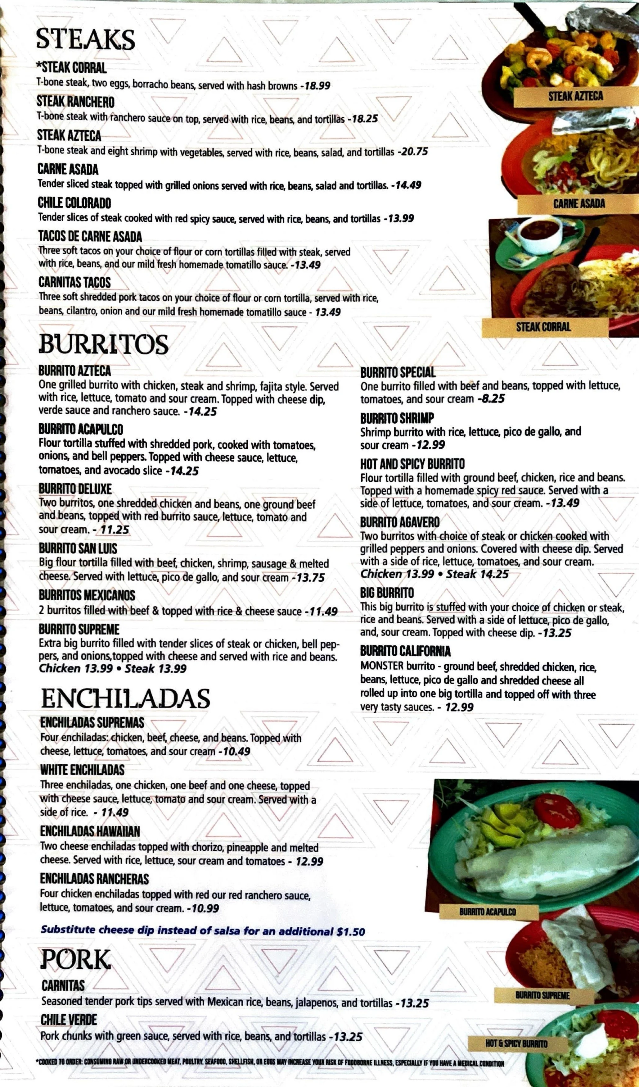 Restaurant menu with sections for steaks, burritos, enchiladas, and pork dishes, featuring options like steak corral, bistec ranchero, burrito azteca, enchiladas supremas, and carnitas.