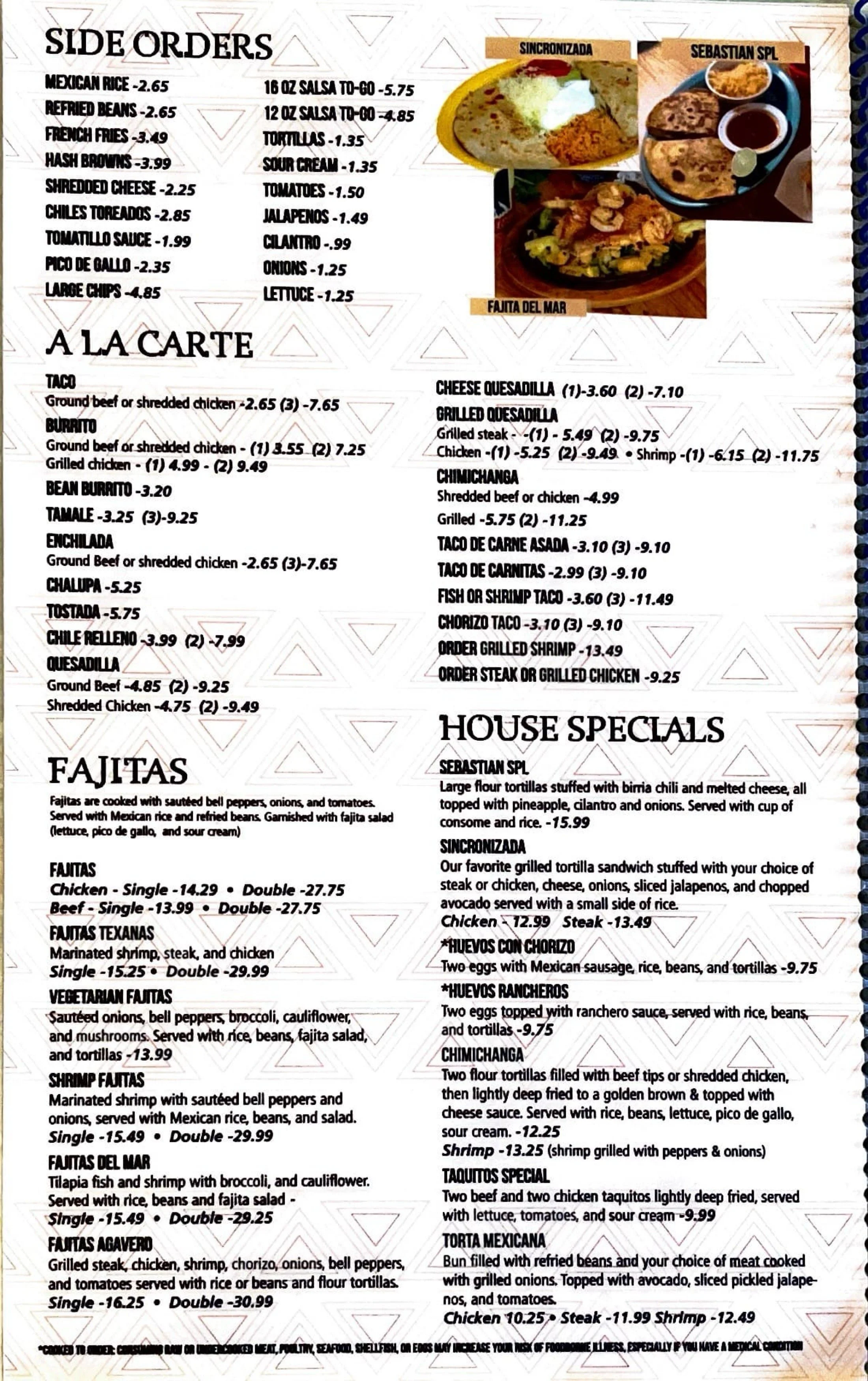 Menu displaying Mexican food options including side orders, a la carte dishes, fajitas, and house specials. Features images of Mexican dishes such as tacos, fajitas, and grilled meats.